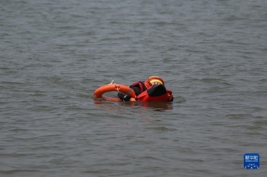 6月2日,在水域救援實戰(zhàn)演習現(xiàn)場,一名模擬被困人員依靠智能水上救生遙控機器人回到岸邊。