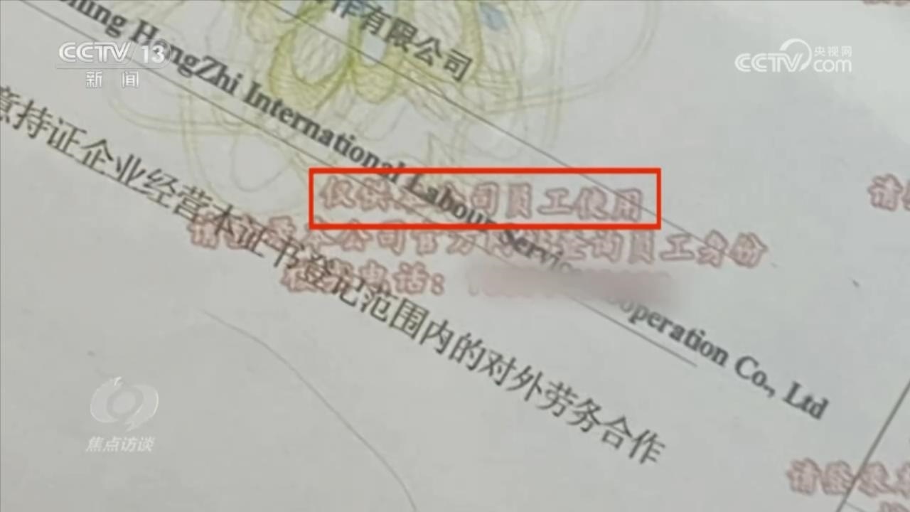 在辦公室擺放的證件是一家名為遼寧恒志國際勞務(wù)合作有限公司的對外勞務(wù)合作經(jīng)營資格證。為了防止別人冒用自己的資質(zhì),在證件上明確寫著“僅供本公司員工使用”,還印上了公司的核實電話。按照這個號碼,記者聯(lián)系了遼寧恒志國際勞務(wù)合作有限公司,公司負(fù)責(zé)人卻表示不認(rèn)識眾國國際。