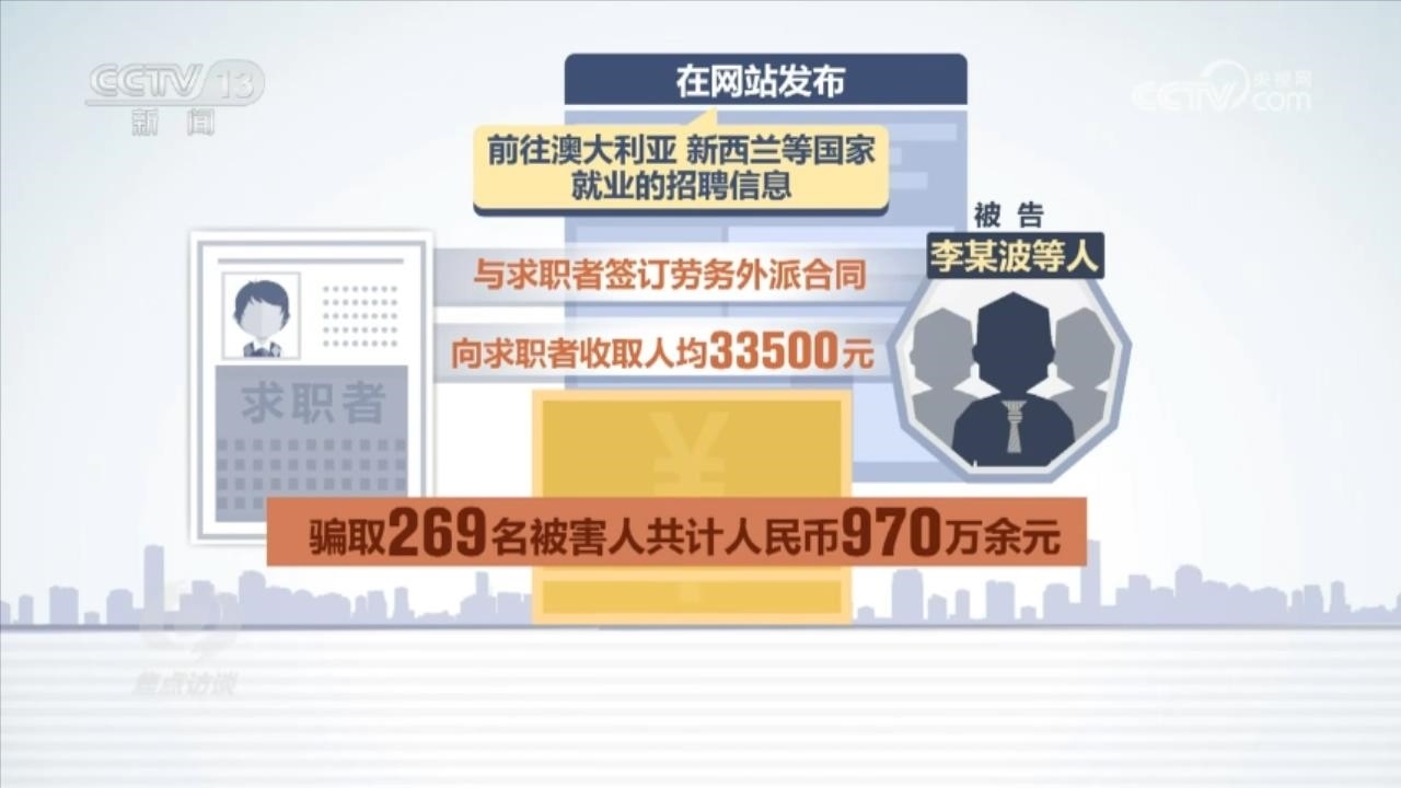 2023年5月,北京市房山區(qū)法院也判決了一起出國勞務(wù)詐騙案,被告李某波因詐騙罪一審判決13年6個月有期徒刑。判決書顯示:被告李某波等人冒用北京一家勞務(wù)派遣有限公司名義開展業(yè)務(wù),在網(wǎng)站發(fā)布前往澳大利亞、新西蘭等國家就業(yè)的招聘信息,與求職者簽訂勞務(wù)外派合同,向求職者收取人均33500元的費用,最終騙取269名被害人共計人民幣970萬余元。檢察官還總結(jié)了這類詐騙案的幾個特點。