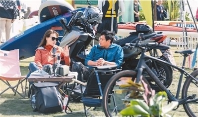 2023淀山湖(昆山)國(guó)際露營(yíng)節(jié)在江蘇省昆山市舉行。露營(yíng)節(jié)涵蓋露營(yíng)裝備展、飛盤活動(dòng)以及露營(yíng)派對(duì)等內(nèi)容,滿足露營(yíng)愛(ài)好者的多樣需求。圖為兩名游客在露營(yíng)裝備展區(qū)交流。唐旭騁攝(人民視覺(jué))
