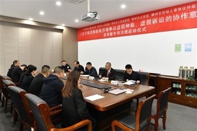 嵊州市委政法委、市法院、市檢察院、市公安局、市勞動仲裁委聯(lián)合舉行《關(guān)于防范和制裁勞動爭議虛假仲裁、虛假訴訟的協(xié)作意見》發(fā)布暨專項(xiàng)治理啟動儀式。