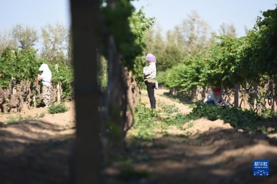 6月21日,在河北省懷來(lái)縣長(zhǎng)城桑干酒莊葡萄種植基地,當(dāng)?shù)剞r(nóng)民在田間勞作。