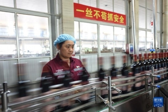 6月21日,在河北省懷來(lái)縣長(zhǎng)城葡萄酒廠,一名工人在葡萄酒生產(chǎn)線上監(jiān)控生產(chǎn)情況。