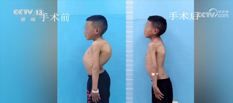 北京大學人民醫(yī)院脊柱外科主任 劉海鷹:另外這兩個特別重的孩子,我們做的頭盆環(huán)牽引,牽引上以后,先到康復醫(yī)院那邊,定期給它一點一點撐開,差不多兩三個月以后,撐到一定程度以后,把胸腔都打開了,肺功能也改善了以后,對于麻醉對于手術(shù)來說更安全,另外對于神經(jīng)功能也比較安全了,在這種前提下我們做一個固定的矯正的手術(shù)。預期來說,矯正70%-80%應該沒問題,矯正到外表上基本上看不見。