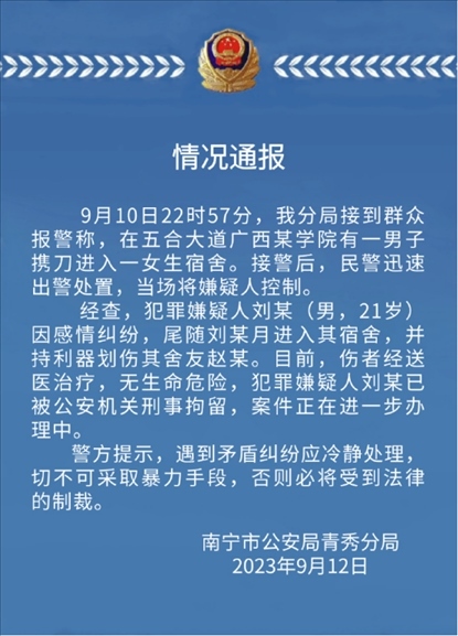 ·廣西外國語學(xué)院發(fā)生持刀傷人事件,警方通報:進女寢持刀傷人男生已被刑拘。