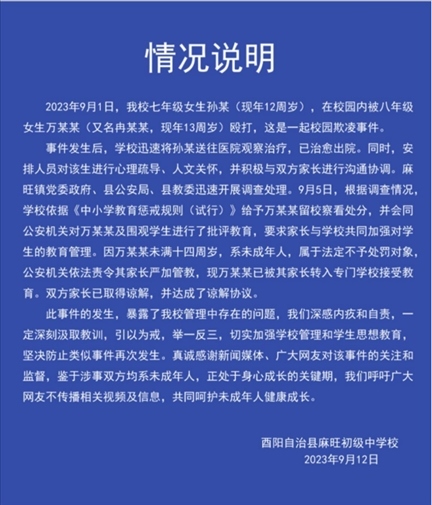 ·重慶酉陽初中女生遭欺凌事件進展:雙方達成諒解協(xié)議,打人者已被轉(zhuǎn)入專門學(xué)校接受教育。