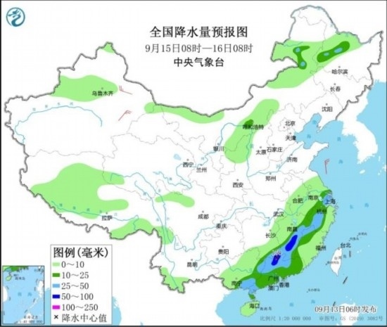 9月15日08時(shí)至16日08時(shí),內(nèi)蒙古東北部、黑龍江西南部、江南中東部和南部、華南大部等地部分地區(qū)有中到大雨,其中,江西中南部、廣東北部等地部分地區(qū)有暴雨或大暴雨(100~150毫米)。新疆東部部分地區(qū)有4~6級(jí)風(fēng)。