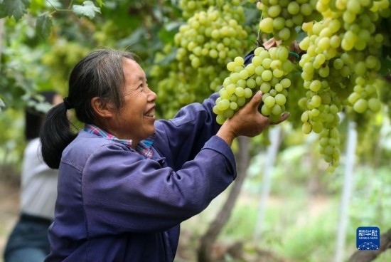 9月14日,果農(nóng)在貴州省開陽(yáng)縣南江鄉(xiāng)龍廣村水果種植基地采摘醉金香葡萄。