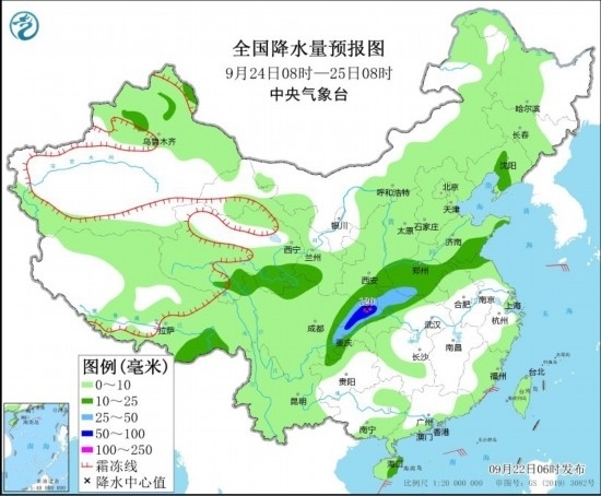 9月24日08時至25日08時,青海南部、甘肅南部、陜西南部、四川東部、重慶、湖北西部和北部、河南、山東南部等地部分地區(qū)有中到大雨,其中,四川東北部、重慶北部等地局地有暴雨或大暴雨(100~120毫米)。