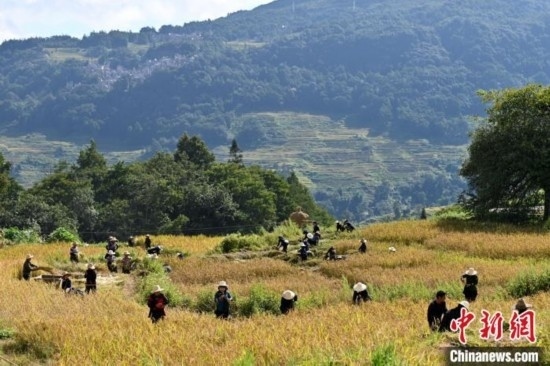 23日,正值秋分時節(jié),也是第六個中國農(nóng)民豐收節(jié),哈尼梯田染上了豐收的色彩。哈尼人民在金黃的稻田里割水稻、捉稻花魚,與四方賓客共慶豐收。為了慶祝豐收,當(dāng)?shù)剡€舉行了大型稻作農(nóng)耕實景表演。身著民族服飾的哈尼族民眾站在田埂上,以稻田為舞臺,以大地山川為背景,唱起悠揚的哈尼古歌,手捧水稻,載歌載舞,表達(dá)崇尚自然、感恩自然之情。