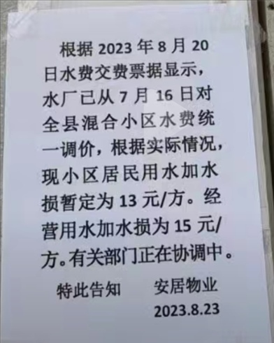 上述網(wǎng)民在《民生熱線》上投訴:“白水縣全縣小區(qū)水費上調,最少的12.6元/方,還有15元/方,以前需7元/方,為什么翻倍漲價?”同時,該網(wǎng)民還列出兩張自來水價格調整的通知。
