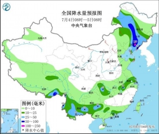 7月4日08時(shí)至5日08時(shí),內(nèi)蒙古東部、黑龍江南部、吉林、遼寧以及蘇皖南部、湖北西南部、湖南北部、廣東南部、廣西北部和西部、云南大部、西藏東南部等地部分地區(qū)有中到大雨,其中,內(nèi)蒙古東北部、黑龍江西南部、吉林中西部、遼寧中東部、西藏東南部等地部分地區(qū)有暴雨或大暴雨(100~120毫米)。內(nèi)蒙古、華北北部和西部、黃淮東部、東北地區(qū)南部等地部分地區(qū)有4~6級(jí)風(fēng)。