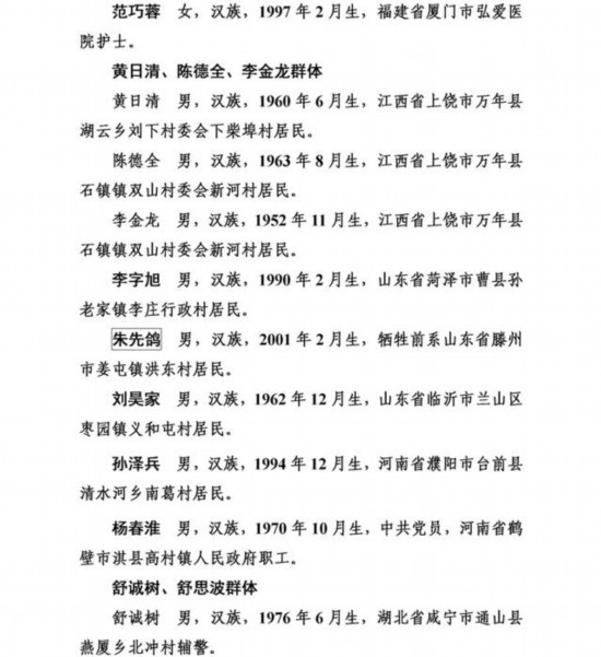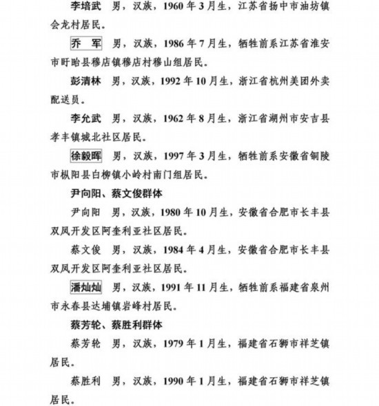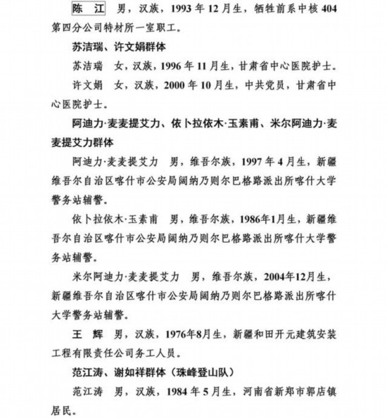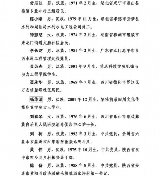 上榜勇士中,有從高橋上跳水救人導(dǎo)致胸椎骨折的外賣小哥彭清林和另一位高橋跳水救人的中學(xué)教師丁成闖;有冒著9級大風(fēng)在海上營救遇險臺胞的漁民蔡芳輪、蔡勝利;有放棄登頂珠峰機會而救助同胞的珠峰登山隊隊員范江濤、謝如祥;有萬米高空機艙里搶救瀕危病人的護士長劉素琴;有勇斗盜賊被刺幾刀仍不退縮的江蘇村民李培武;有身患癌癥卻橫渡淥江河救人的樂觀大姐鐘慧慈;有跳進充滿沼氣深井救人致多器官感染的山東小伙李字旭;更有冒死救援落水群眾壯烈犧牲的潘燦燦、朱先鴿、尹新朋、喬軍、徐毅暉、楊華清、陳江七位勇士,讓我們致以最崇高的敬意!