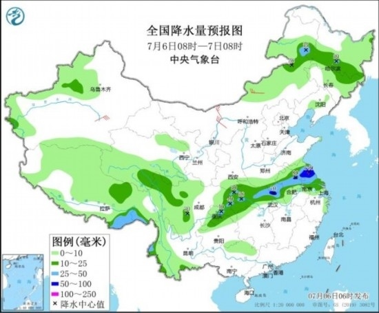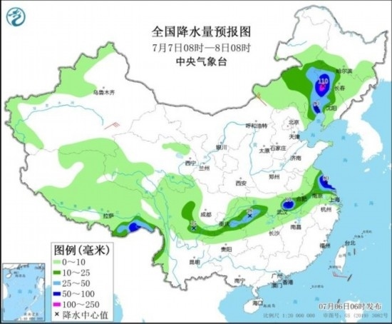 全國降水量預(yù)報圖(7月6日08時-7日08時)。圖片來源:中央氣象臺網(wǎng)站