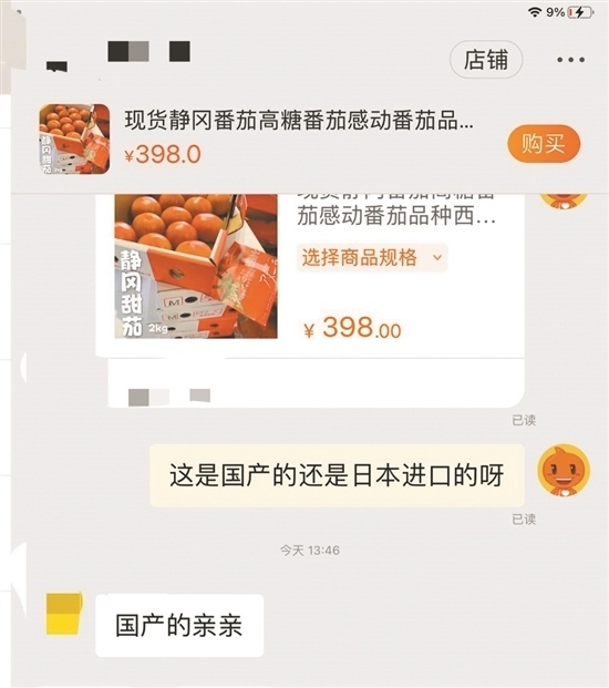 隨后,記者隨機在電商平臺選擇三款標(biāo)明是“進(jìn)口水果”的產(chǎn)品進(jìn)行詢問,結(jié)果對方均表示自己的水果是“國產(chǎn)的”。當(dāng)記者詢問一電商客服,標(biāo)價398元兩斤的“現(xiàn)貨靜岡番茄”和標(biāo)價178元一斤的日本淡雪白草莓是哪里產(chǎn)的時,對方回答“親親,國產(chǎn)的”。