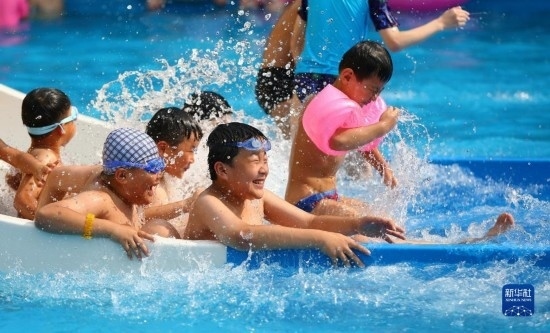 7月8日,小朋友在貴州省鎮(zhèn)遠縣羊坪鎮(zhèn)一家水上游樂園戲水游玩。