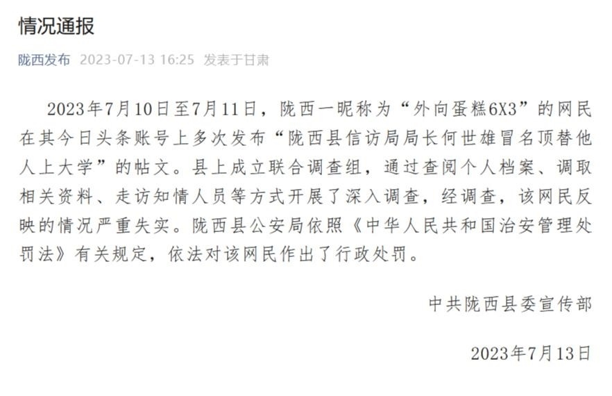 ·信訪局局長被舉報冒名頂替他人上大學(xué),甘肅隴西縣通報:嚴(yán)重失實!