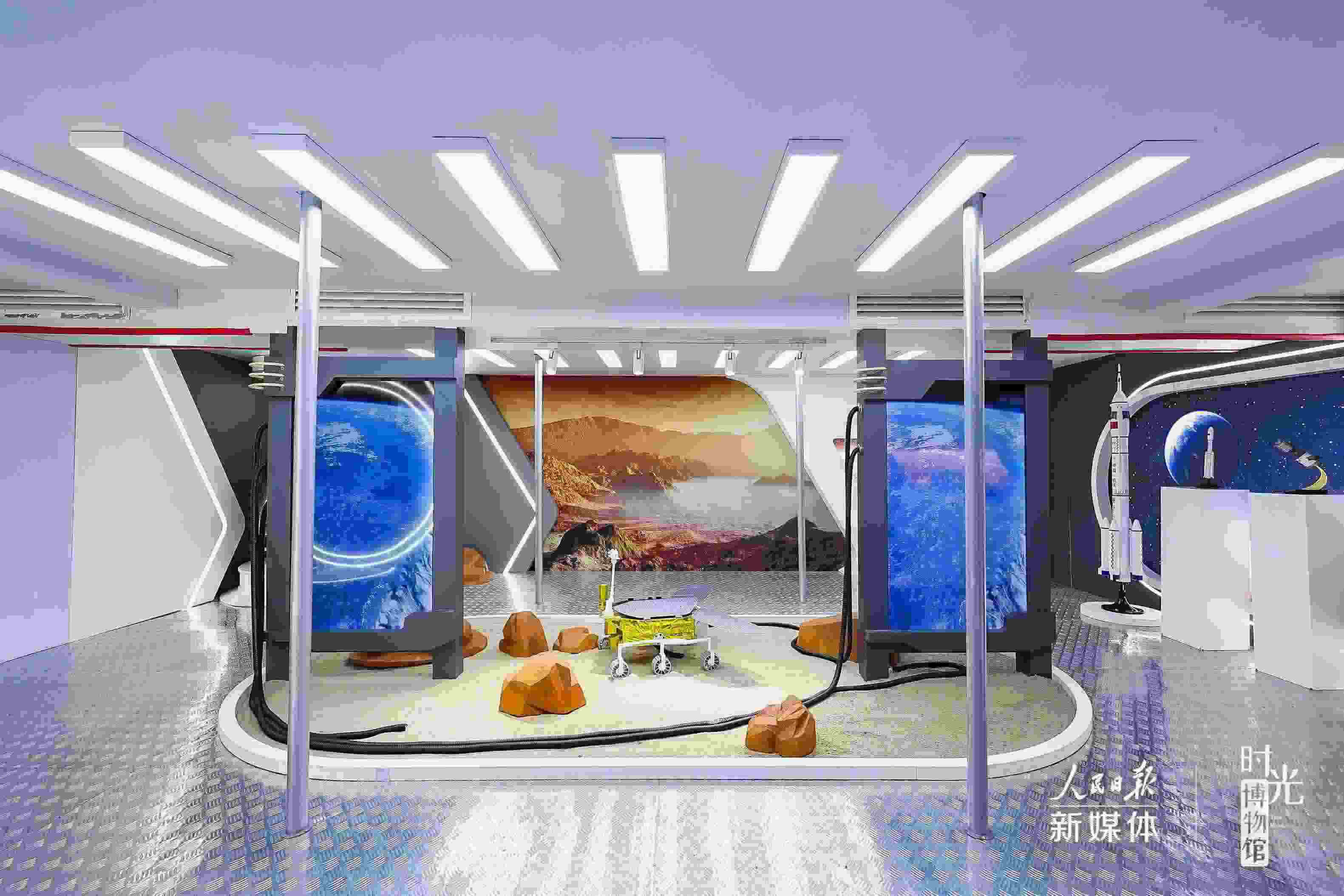 在“星辰大?!闭箙^(qū),航天器模型+視頻演示模擬真實(shí)的太空?qǐng)鼍?,?fù)古電視機(jī)循環(huán)播放過去30年的航天大事件。“神舟”飛天、“天宮”遨游、“嫦娥”攬?jiān)?、“祝融”探火……將浪漫灑向宇宙,?gòu)成了中國人獨(dú)有的星辰大海。