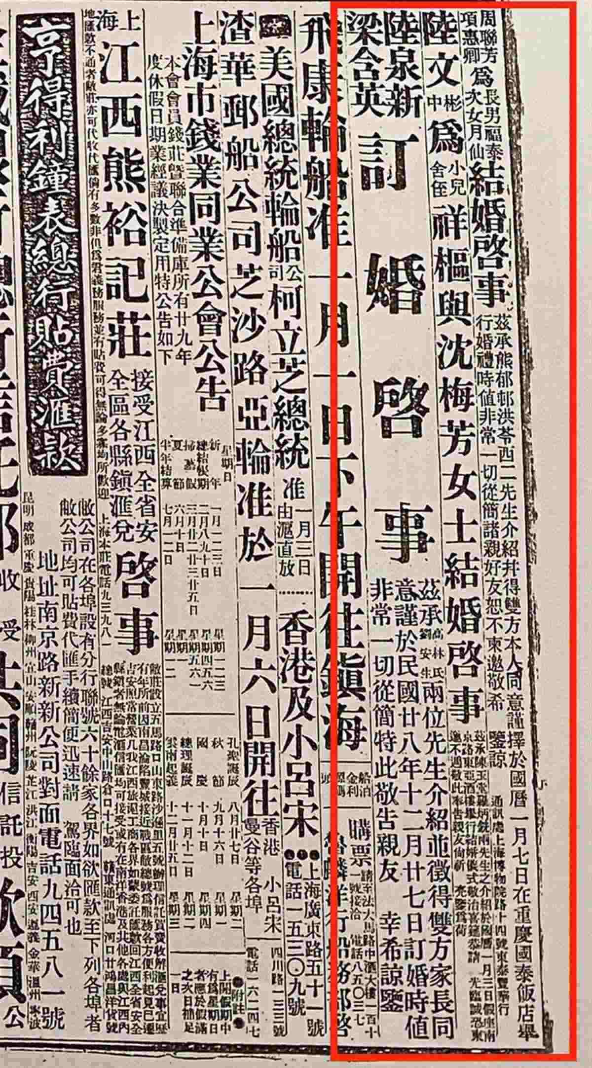 據(jù)了解,登報(bào)結(jié)婚最早在民國風(fēng)行。當(dāng)時(shí),婚姻法和婚姻登記制度并不完善,于是結(jié)婚時(shí)在報(bào)紙上公示成為一種約定俗成的習(xí)慣。一來知會(huì)了遠(yuǎn)近親友,二來有一定法律效力,日后可以作為憑證。三來報(bào)紙便于長久保存,更具紀(jì)念意義。