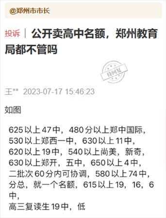 7月16日,有群眾通過頂端新聞“我想@領(lǐng)導(dǎo)”平臺(tái)向鄭州市教育局局長(zhǎng)留言:“掏錢就能上?鄭州中招販賣名額成風(fēng)”“公開賣高中名額,鄭州教育局都不管嗎”等類似留言。