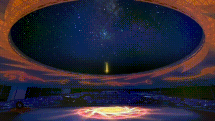 特效數(shù)字焰火與太陽神鳥金芒旋轉(zhuǎn)倒計時融合,依次出現(xiàn)“12、11……1”的倒計時數(shù)字,隨后一朵金色芙蓉花綻放。