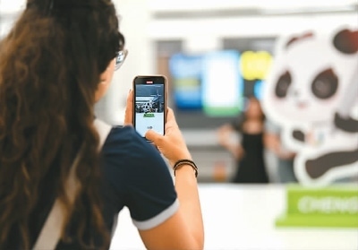 成都天府國際機(jī)場內(nèi),抵蓉的巴西代表團(tuán)成員在等候行李時拍攝機(jī)場內(nèi)的大運(yùn)會吉祥物“蓉寶”裝飾。新華社記者 胥冰潔攝