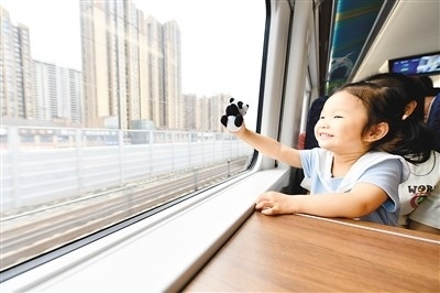 “大運(yùn)號——成都都市圈旅游主題列車”上,小朋友拿著大熊貓文創(chuàng)產(chǎn)品。胡志強(qiáng)攝(人民圖片)
