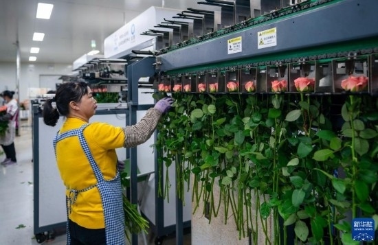 在云天化晉寧花卉產(chǎn)業(yè)現(xiàn)代化示范園內(nèi),花農(nóng)們將鮮切花自動分揀流水線上分揀好的鮮花取下,準(zhǔn)備放入包裝流水線(7月12日攝)。新華社記者 陳欣波 攝
