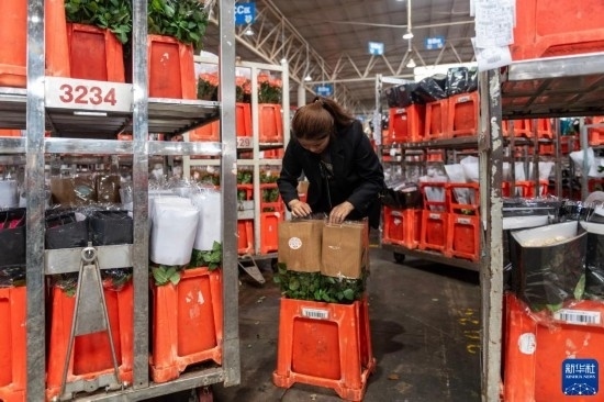 一名工作人員在昆明國際花卉拍賣交易中心內(nèi)對臺車上存放的鮮花進(jìn)行掃碼(7月13日攝)。新華社記者 陳欣波 攝