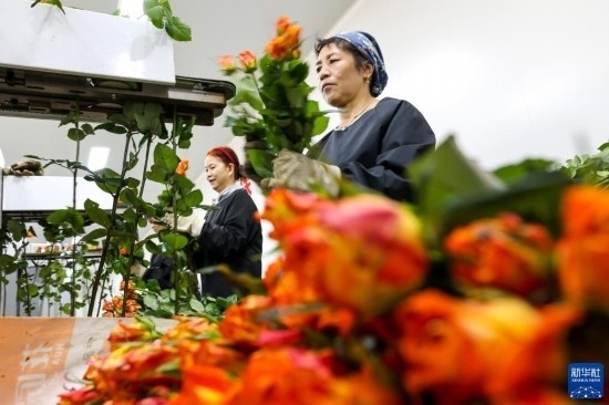 在云天化晉寧花卉產(chǎn)業(yè)現(xiàn)代化示范園內(nèi),花農(nóng)對鮮花進(jìn)行簡單打包(7月12日攝)。新華社記者 陳欣波 攝