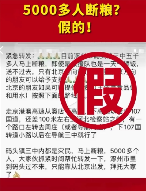 近日,網(wǎng)傳“河北省涿州市碼頭鎮(zhèn)5000多人將斷糧,救援隊(duì)也是一天只吃一頓飯,送不過去”消息,引發(fā)了眾多網(wǎng)民關(guān)注。