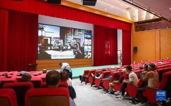 8月11日,居民在吉林省舒蘭市舒蘭三中居民安置點看電影。
