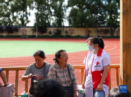 8月11日,在吉林省舒蘭市舒蘭三中居民安置點,舒蘭市紅十字會工作人員與安置點居民聊天。