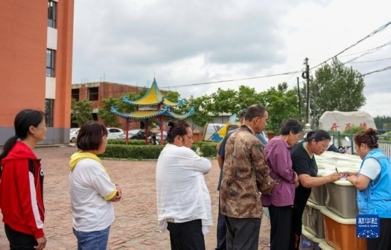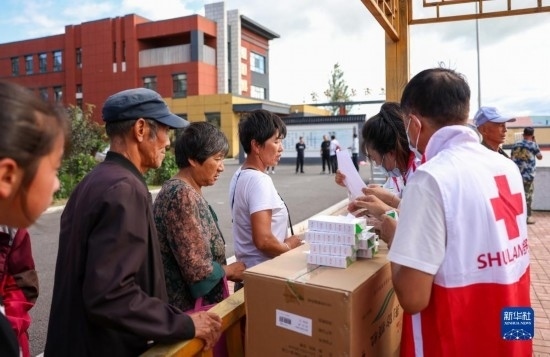 8月11日,居民在吉林省舒蘭市舒蘭三中居民安置點領(lǐng)取舒蘭市紅十字會發(fā)放的藥品物資。
