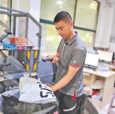 午后,湖北順豐速運有限公司武漢唐家墩網點,張裕和同事們熟練地將大小不一的快遞件分類,裝入不同的袋子中。每裝滿一個編織袋,張裕就在袋口下方貼上二維碼,再用機器掃描登記,確認無誤后裝車發(fā)運。