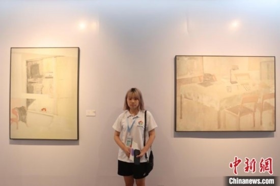 8月26日下午,廣東省廣州市,粵臺學(xué)子中華情——2023兩岸大學(xué)生文化藝術(shù)夏令營啟動儀式暨“融·合”兩岸大學(xué)生藝術(shù)交流展開幕式在廣東華僑博物館舉行。圖為臺灣學(xué)生在兩岸大學(xué)生藝術(shù)交流展作品前留影。吳善基攝