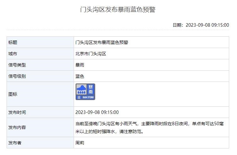 當(dāng)前至傍晚門(mén)頭溝區(qū)有小雨天氣,主要降雨時(shí)段在8日夜間,單點(diǎn)有可達(dá)50毫米以上的短時(shí)強(qiáng)降水,請(qǐng)注意防范。