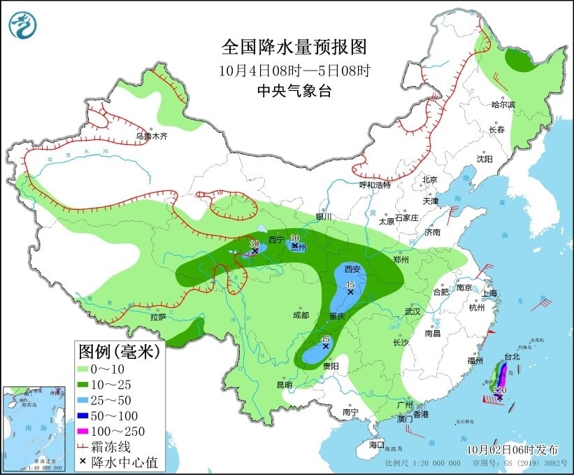 10月4日08時(shí)至5日08時(shí),西藏東南部、青海中東部、甘肅中南部等地部分地區(qū)有中到大雪或雨夾雪,局地有暴雪。黑龍江北部、陜西中南部、四川東部、重慶、貴州西部、湖北西北部、河南西部以及臺灣島大部等地部分地區(qū)有中到大雨,其中,臺灣島東部和南部等地部分地區(qū)有暴雨或大暴雨(100~220毫米)。內(nèi)蒙古中部、黑龍江西南部、山東中部等地部分地區(qū)有4~6級風(fēng)。渤海、渤海海峽、黃海大部、東海北部將有6~7級風(fēng)、陣風(fēng)8級,東海西南部海域風(fēng)力將有7~8級風(fēng)、陣風(fēng)9級。臺灣以東洋面將有12~14級風(fēng)、陣風(fēng)15級,臺灣海峽將有10~12級風(fēng)、陣風(fēng)13級,巴士海峽將有11~12級風(fēng)、陣風(fēng)13級(見圖3)。