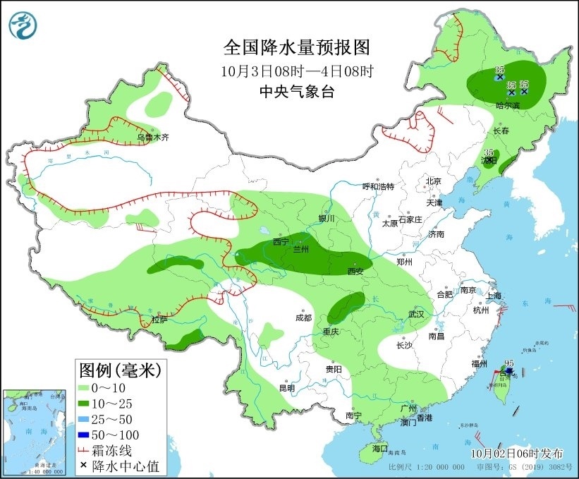 10月3日08時(shí)至4日08時(shí),黑龍江西南部、遼寧東部、西藏東南部、青海東部、甘肅東南部、陜西中南部、重慶北部以及臺灣島北部等地部分地區(qū)有中到大雨,其中,臺灣島北部和東部等地部分地區(qū)有暴雨(50~95毫米)。內(nèi)蒙古東南部、西藏北部等地部分地區(qū)有4~6級風(fēng)。渤海、渤海海峽、黃海大部、東海北部將有6~7級風(fēng)、陣風(fēng)8級,東海西南部海域風(fēng)力將有7~8級風(fēng)、陣風(fēng)9級。臺灣以東洋面將有7~8級轉(zhuǎn)9~10級風(fēng)、陣風(fēng)9級轉(zhuǎn)11級(見圖2)。
