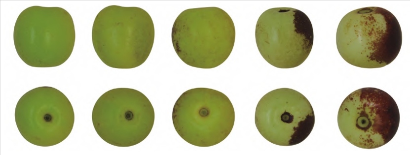 ▲從左至右依次為綠熟期、白熟期、點(diǎn)紅期、1/3 紅期、半紅期的果實(shí)