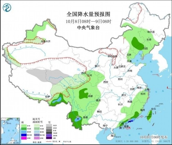 圖2 全國(guó)降水量預(yù)報(bào)圖(10月8日08時(shí)-9日08時(shí))