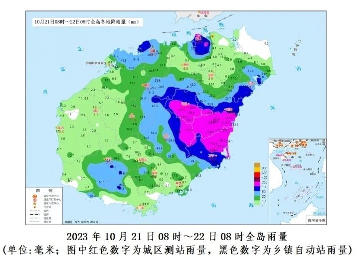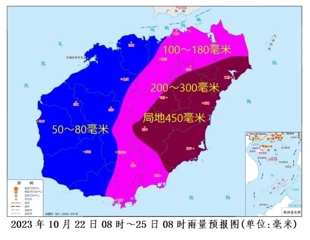 預(yù)計(jì),10月22日08時~25日08時各地累積雨量:文昌、瓊海、瓊中、屯昌和萬寧200~300毫米、局地450毫米,海口、澄邁、定安、保亭、陵水和三亞100~180毫米,其余市縣50~80毫米。