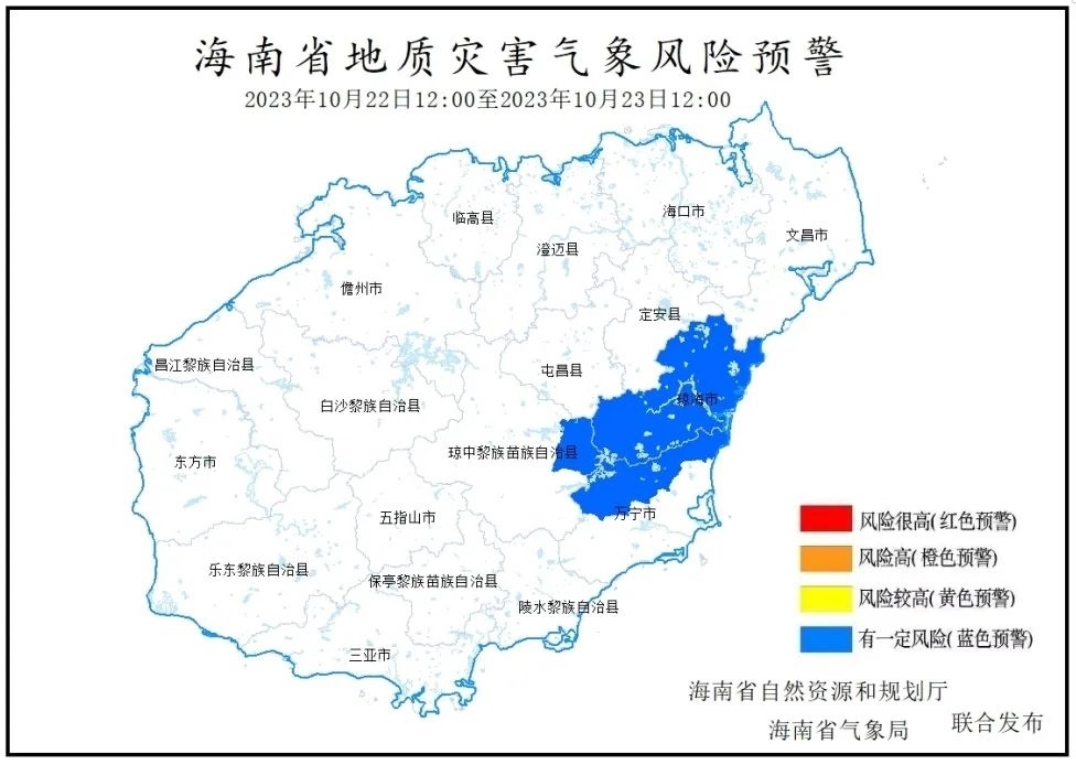 海南省自然資源和規(guī)劃廳、海南省氣象局2023年10月22日10時聯(lián)合發(fā)布地質(zhì)災(zāi)害氣象風(fēng)險預(yù)警:根據(jù)海南省氣象臺前期降雨實(shí)況和未來24小時降雨預(yù)報,預(yù)計(jì)未來24小時(2023年10月22日12:00-10月23日12:00)瓊海市全境,萬寧市龍滾鎮(zhèn)、三更羅鎮(zhèn)、北大鎮(zhèn),瓊中縣中平鎮(zhèn)降雨誘發(fā)地質(zhì)災(zāi)害有一定風(fēng)險,為Ⅳ級風(fēng)險預(yù)警(藍(lán)色預(yù)警)。請上述市縣、鄉(xiāng)鎮(zhèn)政府及有關(guān)部門做好地質(zhì)災(zāi)害防御工作。