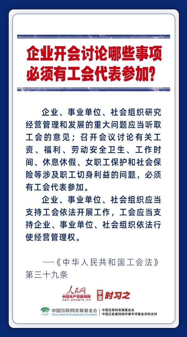 日前,中華全國(guó)總工會(huì)新一屆領(lǐng)導(dǎo)班子產(chǎn)生。黨和政府歷來重視工會(huì)的地位作用,十分注重加強(qiáng)工會(huì)法律制度建設(shè),專門為廣大職工制定了《中華人民共和國(guó)工會(huì)法》。網(wǎng)約車司機(jī)、快遞員、外賣配送員能入工會(huì)嗎?產(chǎn)業(yè)工人隊(duì)伍建設(shè)改革的目標(biāo)是什么?企業(yè)開會(huì)討論哪些事項(xiàng)必須有工會(huì)代表參加?一起來了解。