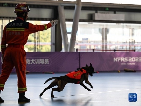 11月8日,搜救犬訓(xùn)導(dǎo)員和搜救犬在比賽中。