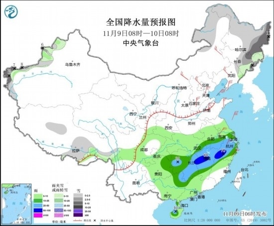圖3 全國(guó)降水量預(yù)報(bào)圖(11月9日08時(shí)-10日08時(shí)) 圖片來(lái)源:中央氣象臺(tái)網(wǎng)站