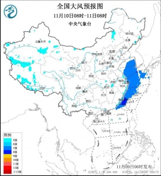11月10日08時(shí)至11日08時(shí),黃海中部和南部海域、東海大部海域、臺(tái)灣海峽、南海東北部偏北海域?qū)⒂?~8級(jí)、陣風(fēng)9~10級(jí)的大風(fēng)。新疆東部和南部、西藏南部和西北部、內(nèi)蒙古東部、東南沿海將有5~6級(jí)、陣風(fēng)7~8級(jí)的大風(fēng)。中央氣象臺(tái)11月9日06時(shí)發(fā)布大風(fēng)藍(lán)色預(yù)警(見(jiàn)圖1、2)。