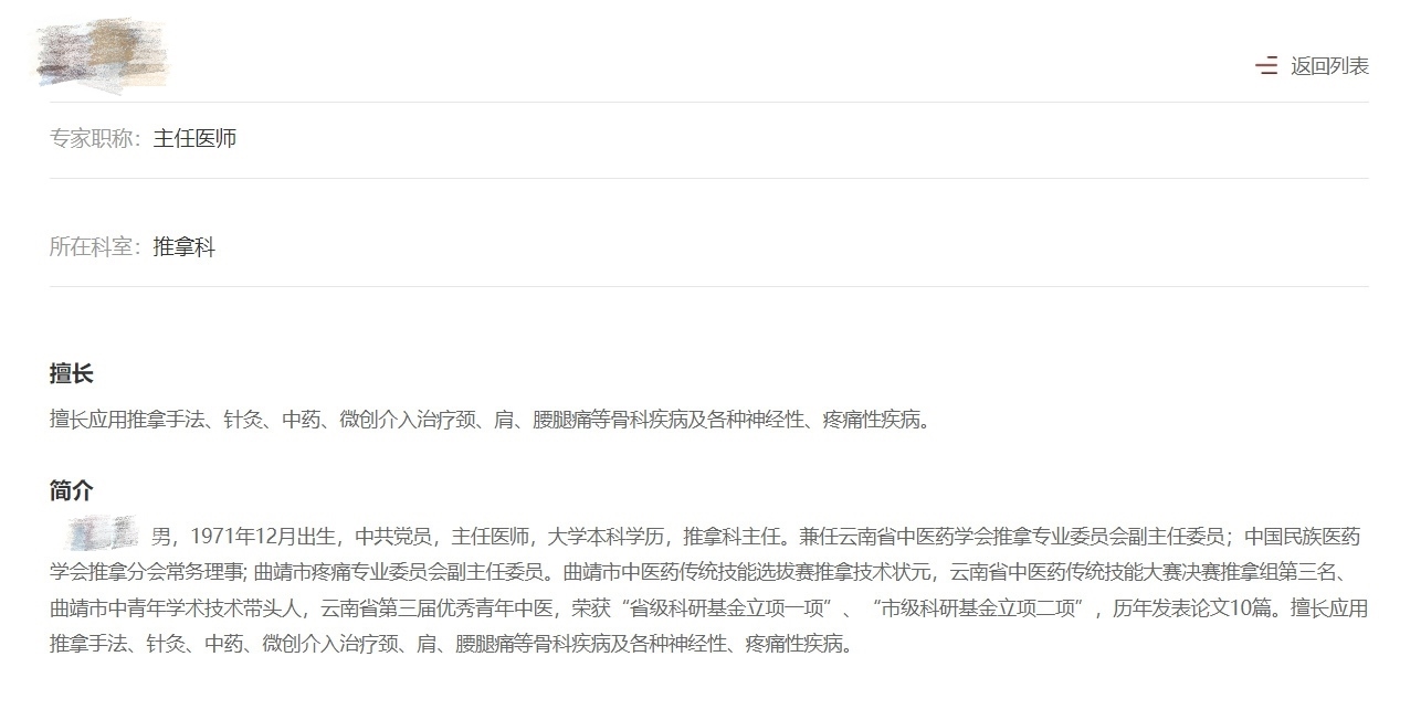 而在曲靖中醫(yī)醫(yī)院官網(wǎng)上,張樹(shù)昆醫(yī)生的簡(jiǎn)介為:推拿科主任醫(yī)師,擅長(zhǎng)應(yīng)用推拿手法、針灸、中藥、微創(chuàng)介入治療肩、頸、腰腿等骨科疾病及各種神經(jīng)性、疼痛性疾病。