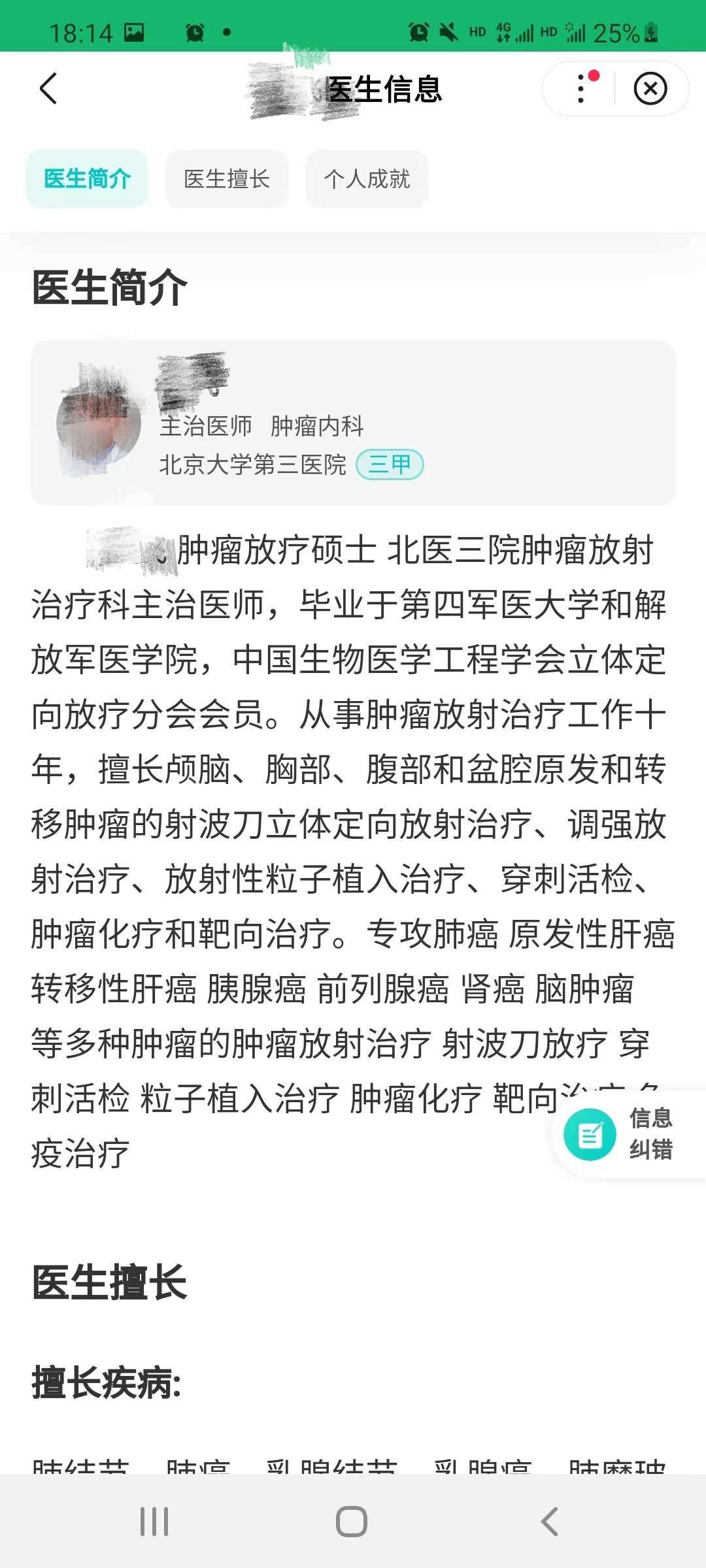 吳先生發(fā)給記者的百度健康頁(yè)面上顯示:這位醫(yī)生是腫瘤內(nèi)科的主治醫(yī)師,但其個(gè)人介紹里又寫(xiě)著他是腫瘤放療科主治醫(yī)師,放療科醫(yī)生的執(zhí)業(yè)證書(shū)和內(nèi)科不同,吳先生也對(duì)平臺(tái)提出過(guò)質(zhì)疑,醫(yī)生到底是哪個(gè)科的?是否專業(yè)?