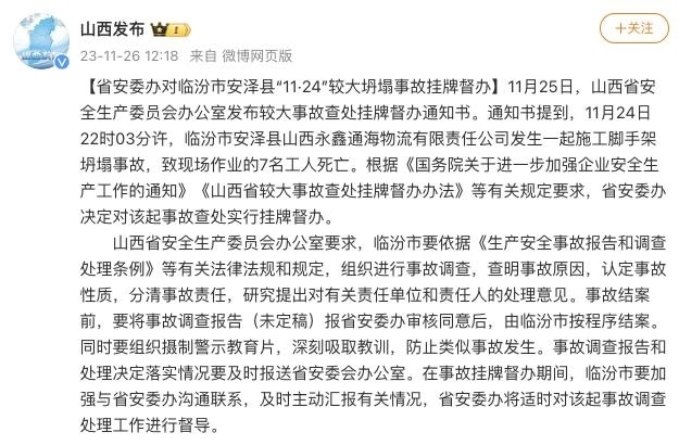 ·山西省安委辦對(duì)安澤縣腳手架坍塌致7人遇難事故掛牌督辦。